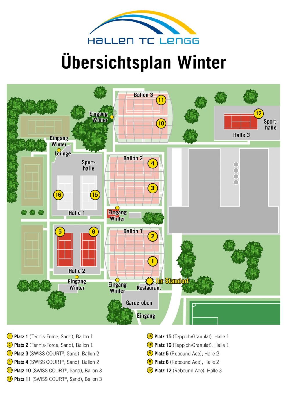 Der Hallen TC Lengg vermietet in den beiden Ganzjahreshallen während des ganzen Jahres Tennisplätze mit dem modernen und gelenkschonenden Struktur-Veloursbelag (mit wenig Granulat) und dem Rebound Ace.